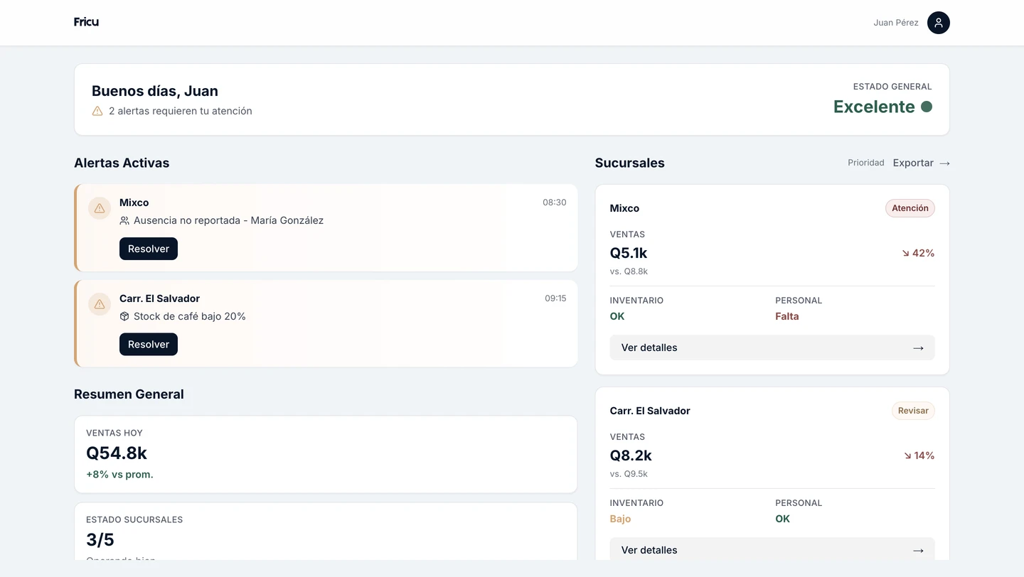 Con Fricu, controla todas tus sucursales desde una pantalla. Verde, amarillo o rojo. Sin reportes confusos, sin mensajes perdidos en WhatsApp.